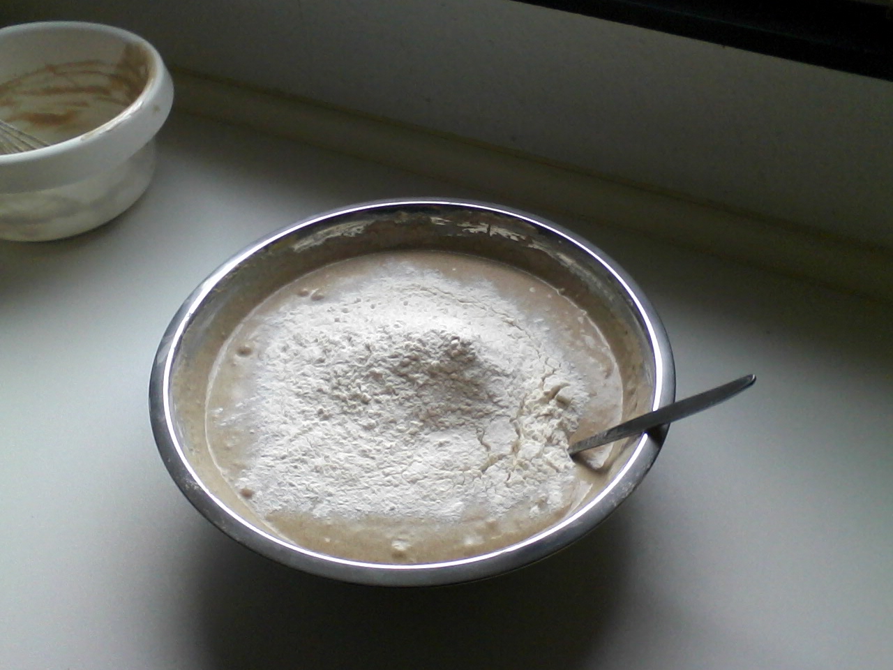 Alles bereit stellen für mein Grau-Brot (Roggen-Misch-Brot, ungefähr 60% Roggen- und 40% Weizen-Mehl)
